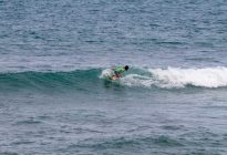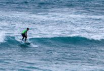 The onshore-west wind picked up quickly this morning despite the clean conditions at first light, and the forecast predicting that the wind would remain offshore through the early morning session. Our beginners were still out there bright and early to test their skills in the challenging conditions. The larger swell, coming in at 5ft. at 14 seconds, produced head-high set waves with workable wave faces despite the unfavorable wind.