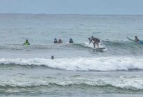 Our Beginner group surfed Black Stone again after the amazing day they had yesterday. The swell has picked up in size to 4.5 ft. at 16 seconds, producing overhead set waves at Black Stone, and well-overhead sets at the more exposed breaks in the Nusa Dua area. The wind blew nicely offshore before the rain showers came. The low tide of -0.3 meters was at 7:25 AM, pushing our session back to late morning.