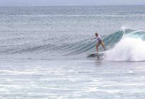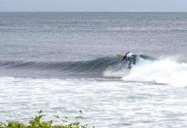 Our intermediate surfers were off to Mushroom Rock this morning, while our beginners took the opportunity afforded to us by the light wind to surf Baby Padang. At Mushroom Rock, the swell is still producing overhead and barreling set waves on the outside, providing excellent waves for advanced surfers. Our crew surfed a smaller peak down the beach which offered overhead set waves from a swell of 5 ft. at 14 seconds. The waves were nicely groomed by a light offshore breeze which kept the wave faces open beautifully.