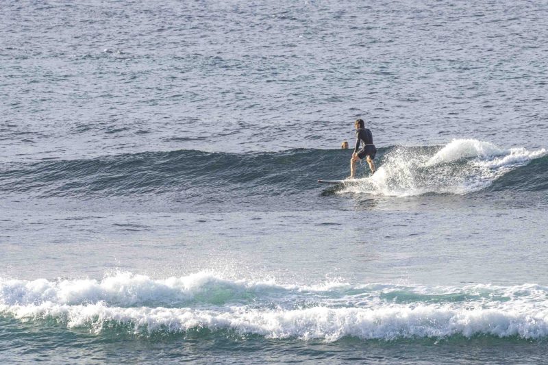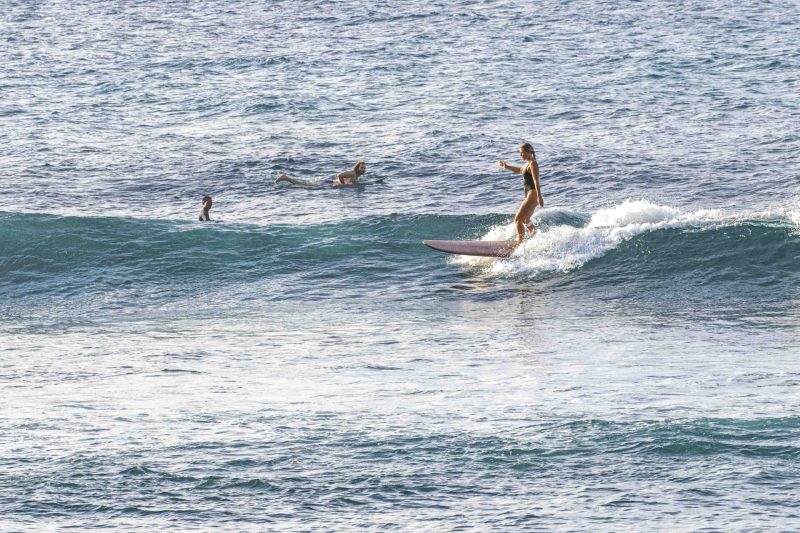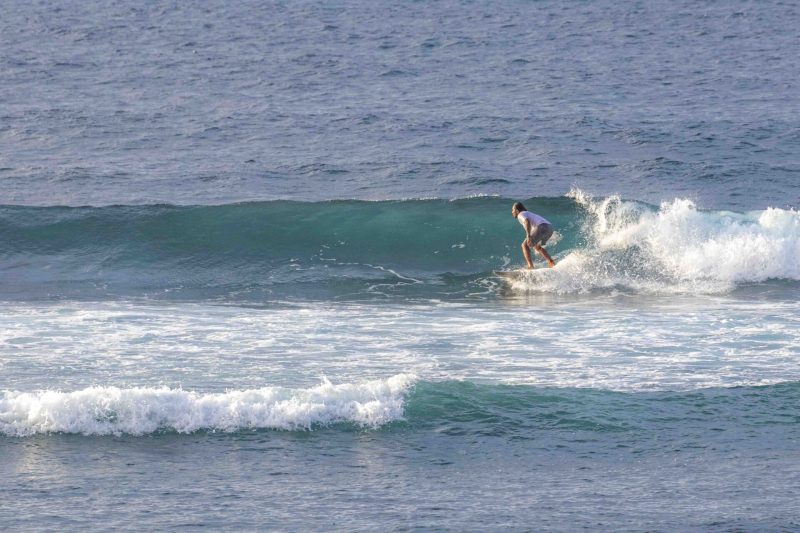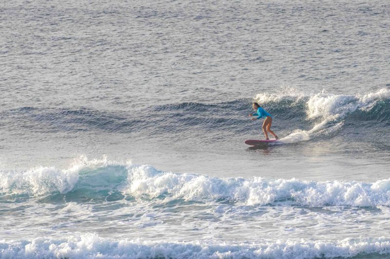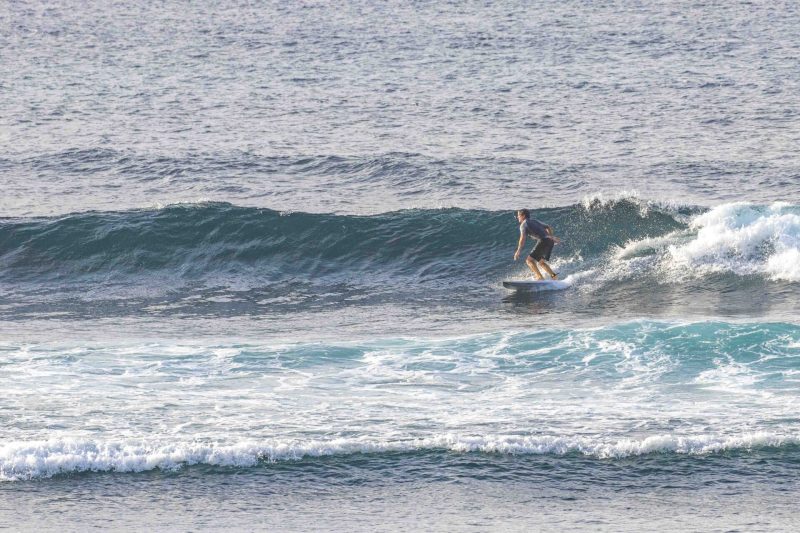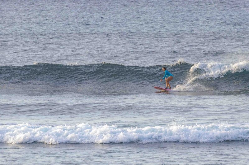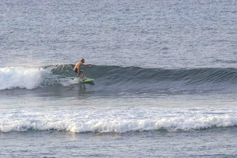With a dropping swell and a persistent breeze from the west, our intermediate surfers set off to Greenball for a sunrise paddle out. Greenball is infamous for its many steps but the wave is certainly worth the effort. The surfers enjoyed shoulder-high waves from a swell of 3 ft. at 11 seconds from 208 degrees. The wind blew lightly side-shore from the west, leaving the sea state lightly textured. The surfers opted to surf the playful right-breaking wave as it provided steeper sections that were the perfect platform for improving their top turns.