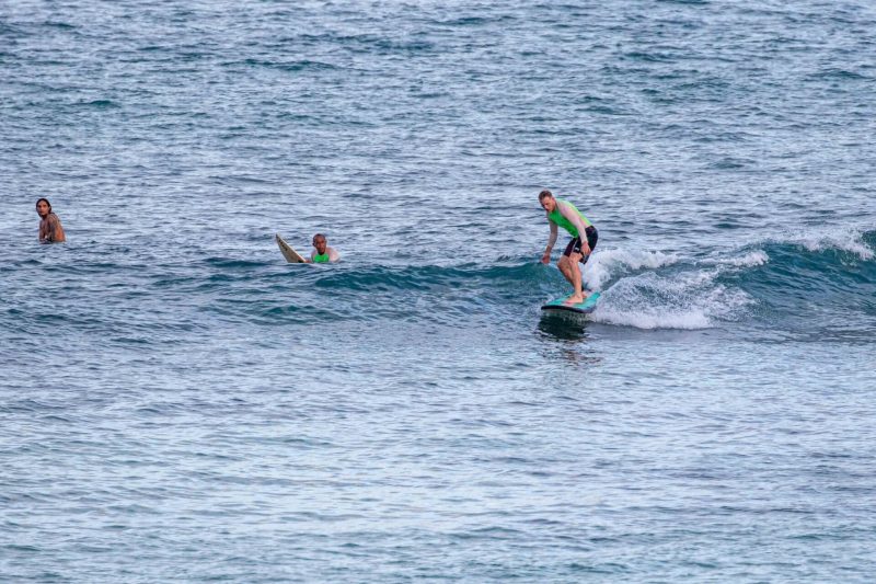 The breeze from the west has calmed enough for our beginner surfers to enjoy the long-rides at Padang Padang! The swell has picked up just enough overnight to offer up fun, waist-high, beginner-friendly waves. The wind blew lightly onshore, however the faces of the waves were clean enough for fun rides for all. The swell has picked up to 4 ft. at 11 seconds from 205 degrees, a welcome bump from yesterday’s very small surf. The surfers worked on improving their pop-ups and riding across the face of the wave with improved balance and control. You can see from the faces that today was an enjoyable day.