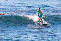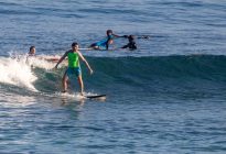 Pristine surfing conditions this morning at the perfect beginner wave at Padang Padang. Our beginner surfers enjoyed classic April/May morning conditions with a clean sea state and an offshore breeze blowing lightly. The remaining traces of the previous swell have been replaced by a small long-period swell of 3.5 ft. at 17 seconds coming from 215 degrees, which was good for up to shoulder-high set waves for the surfers’ maximum enjoyment. The surfers worked on identifying when to go left and right, catching green waves without being pushed, and beginning to ride down the line.