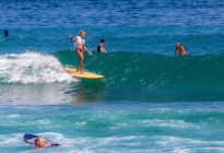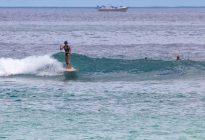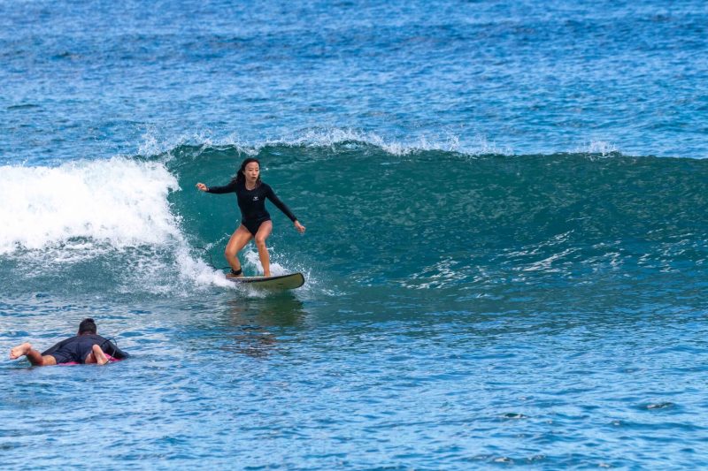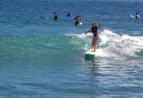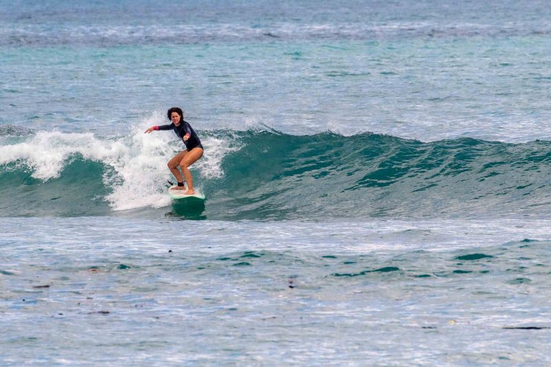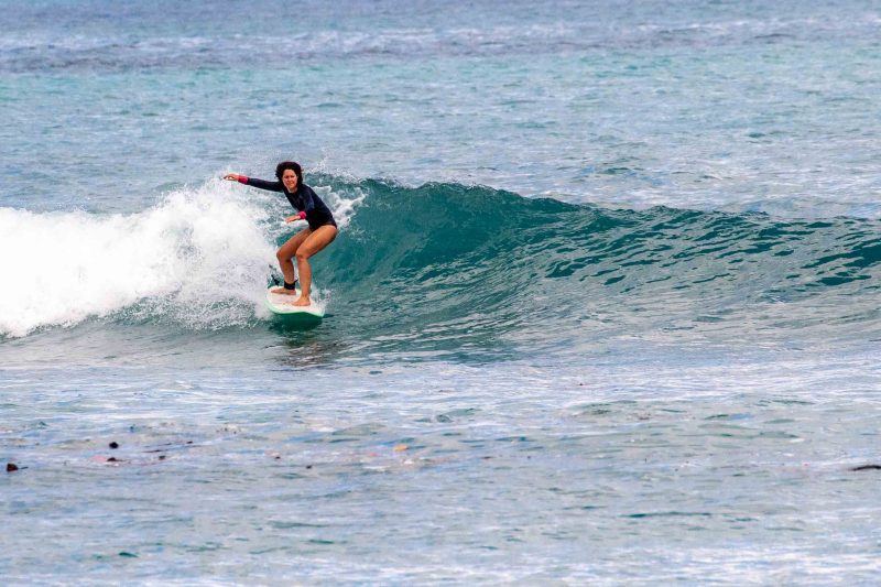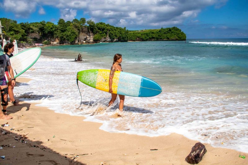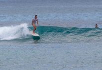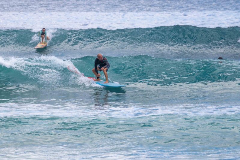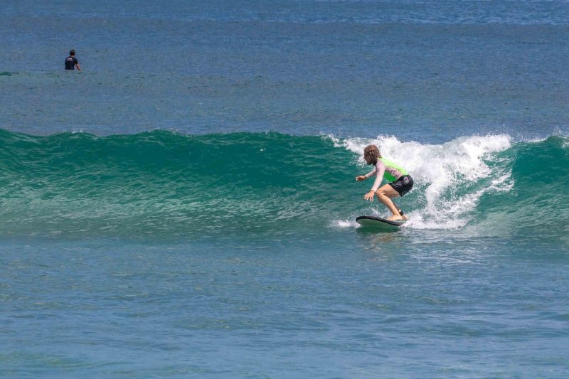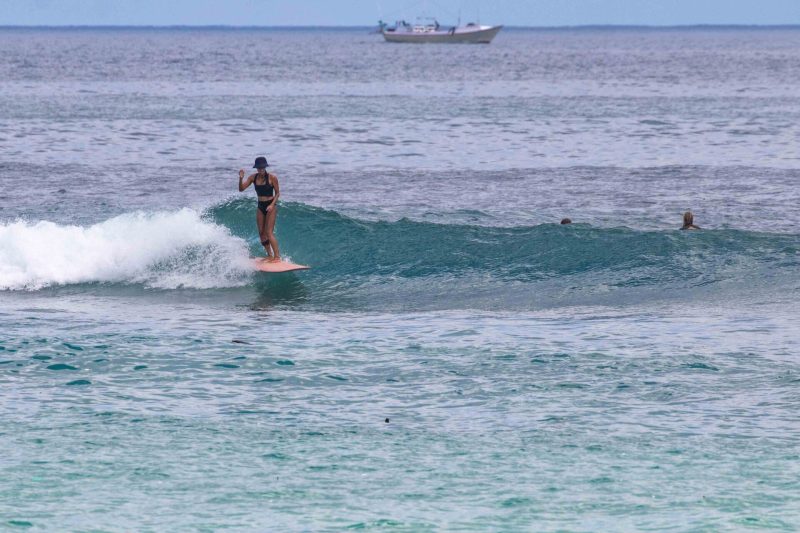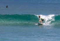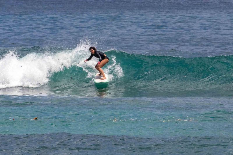 With the large swell from a few days ago fading away and a quickly rising tide, our intermediate surfers headed to Balangan, which is an excellent wave for intermediates when the tide is high and the swell small or moderate in size. At Balagan, our surfers found fun, shoulder-high lines set amongst a light side shore breeze and sunshine. The swell came in at 5 ft. at 12 seconds from 200 degrees, and the morning’s high tide reached 2.4 meters at 10:00 AM. The surfers enjoyed the long left-breaking waves (and even some rights!) and worked on reducing the time it takes to gain control of the surfboard after a pop-up.