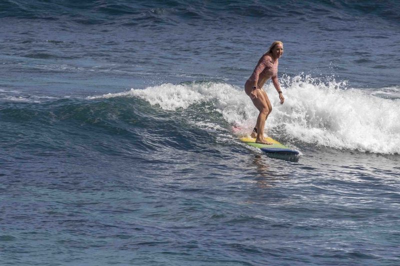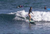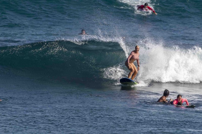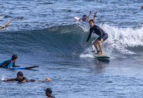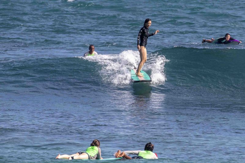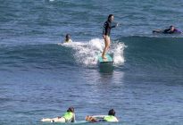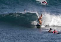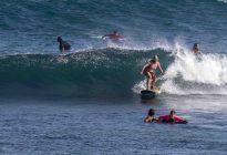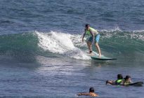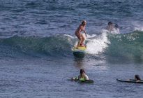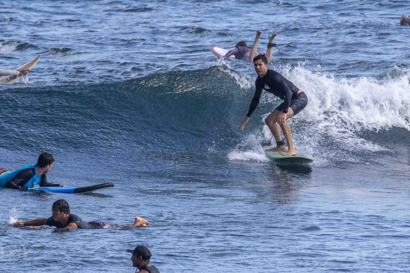 Our beginner surfers headed to Baby Padang this morning where they enjoyed excellent surfing conditions! The swell has jumped up slightly in size to shoulder to head-high on the set waves, with the surf forecast showing 5.5 ft. at 13 seconds from 210 degrees. The wind blew moderately side-shore, which caused a slight texture in the line-up. Despite the texture, the wave faces remained clean for long, smooth rides. The surfers worked on identifying the feeling of the surfboard beginning to plane on the wave, which is used as a signal to initiate your pop-up.