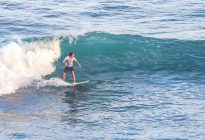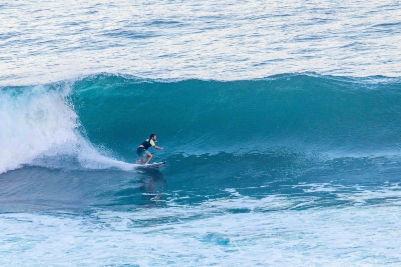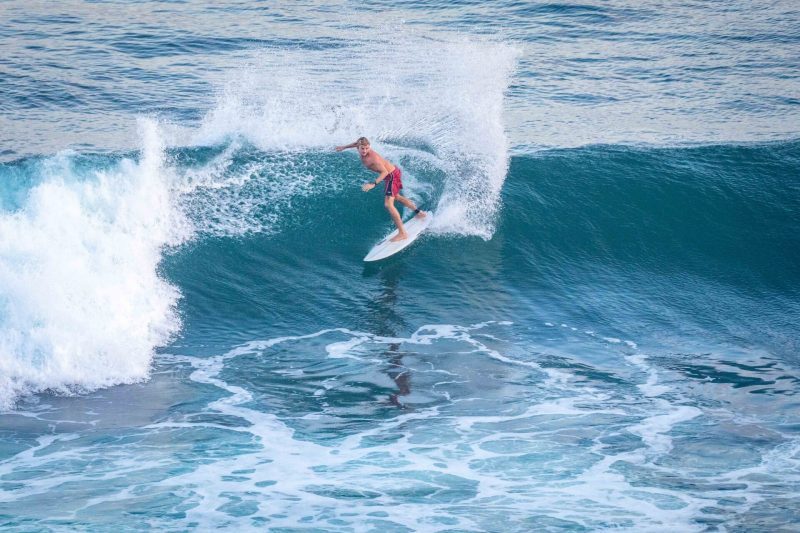 Our advanced group headed to Uluwatu this morning to challenge themselves at Bali’s most famous wave. The swell has increased in size since yesterday, and the waves came in at overhead high with the occasional larger set coming in. The wind blew lightly offshore, and the rides were long. The surfers enjoyed testing themselves on the steep drops, which required paddling hard down the face of the wave to avoid being thrown with the lip.