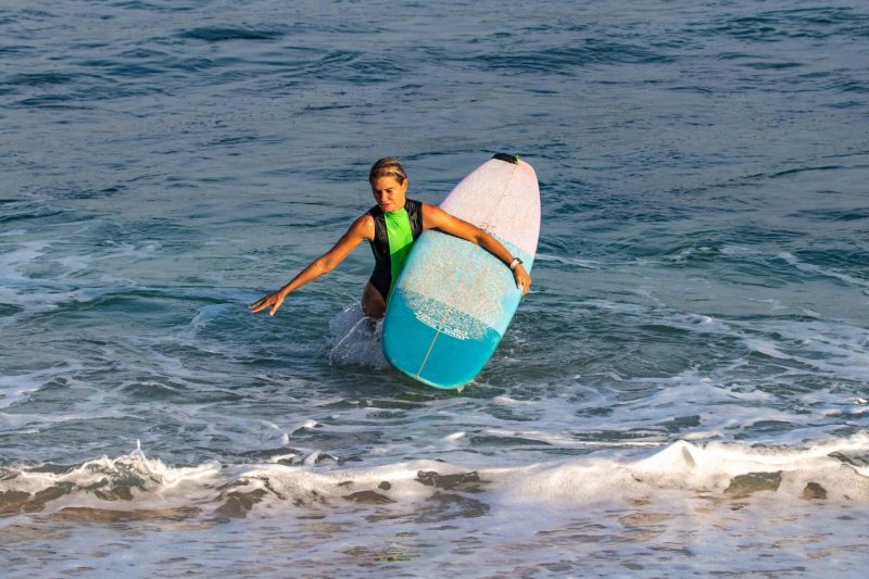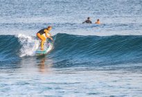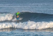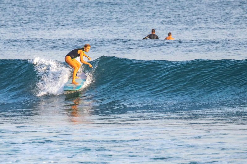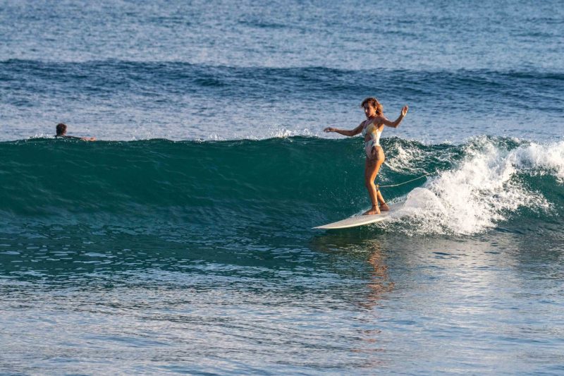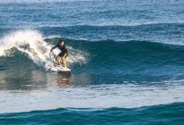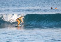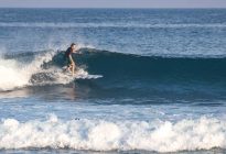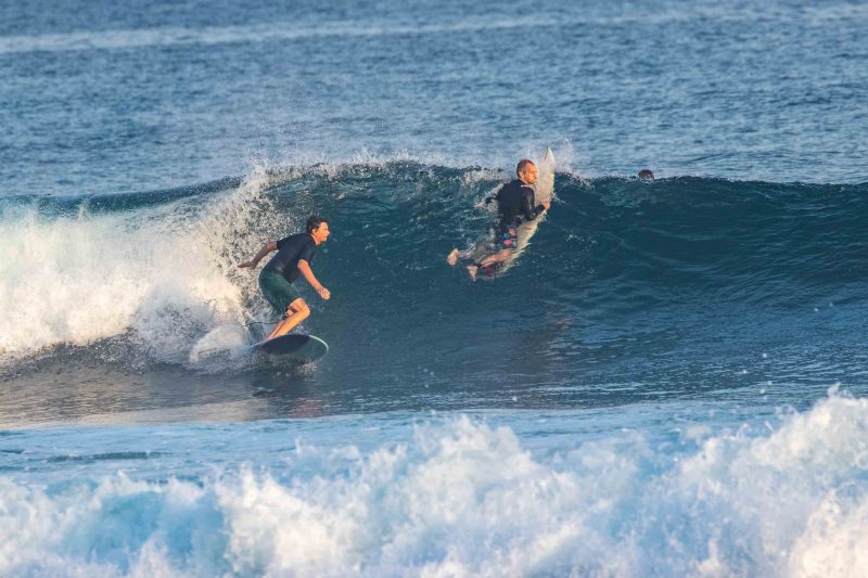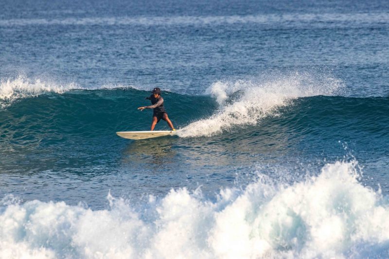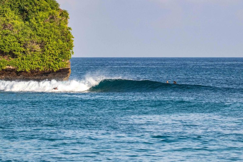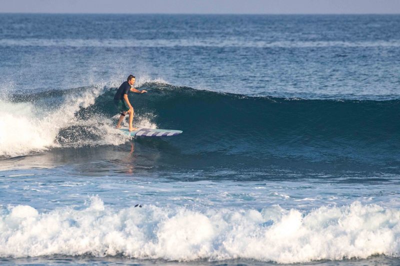 Our group of intermediate surfers had a fantastic time surfing the beautiful peaks at Balangan. The swell has dropped in size since yesterday, which was welcomed after yesterday’s powerful long-period swell. The surfers enjoyed sets just overhead, punctuated by numerous smaller waves for everyone’s delight. The wind had picked up to a moderate pace, while the offshore direction preserved clean wave faces. The surfers with the ability to ride high on the wave face were rewarded with long, open walls, while the improving surfers worked on generating speed by pumping the surfboard and optimizing their weight distribution.