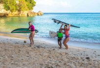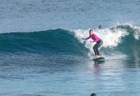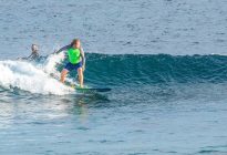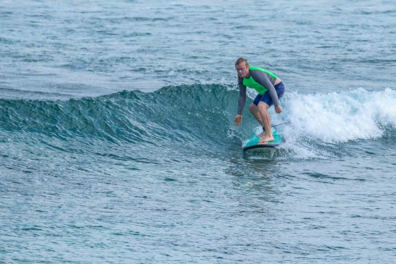 Great beginner surfing conditions at Padang Padang! We are still waiting on the new, long-period swell to arrive, but there were plenty of fun waves for all. The waves were in the shoulder-high range for most of the session, with a few infrequent larger set waves for those sitting farthest outside. The Tradewind was blowing perfectly light offshore, which is expected during the dry season. The surfers worked on popping up with their feet in the correct position, which is essential for a successful ride.