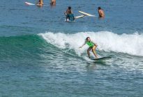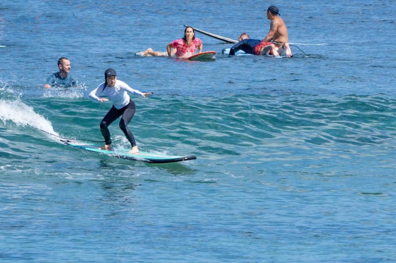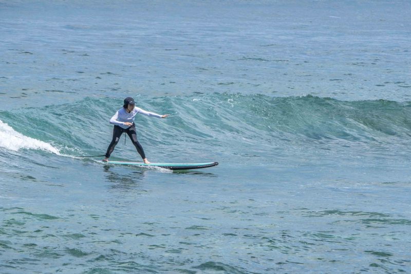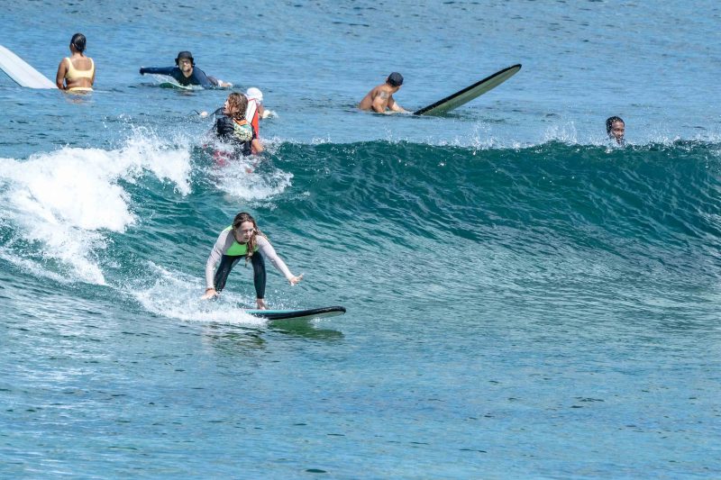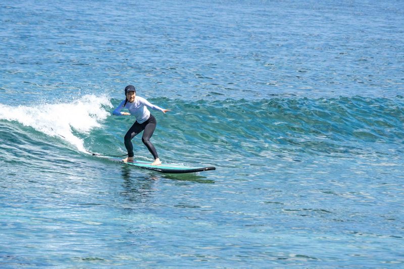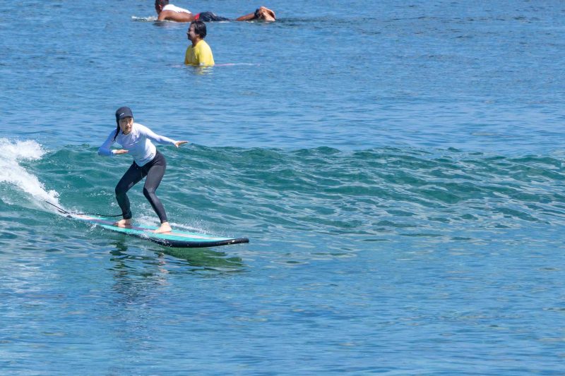 The beginner surfers worked on getting to their feet and controlling their surfboard. Something that is more easily done when the wave is as long as it is at Padang Padang. Additionally, every wave breaks in a similar way, which further speeds up the time it takes to get up and riding with control.