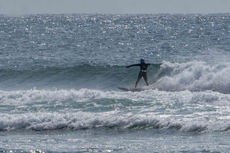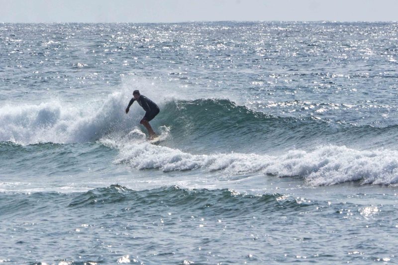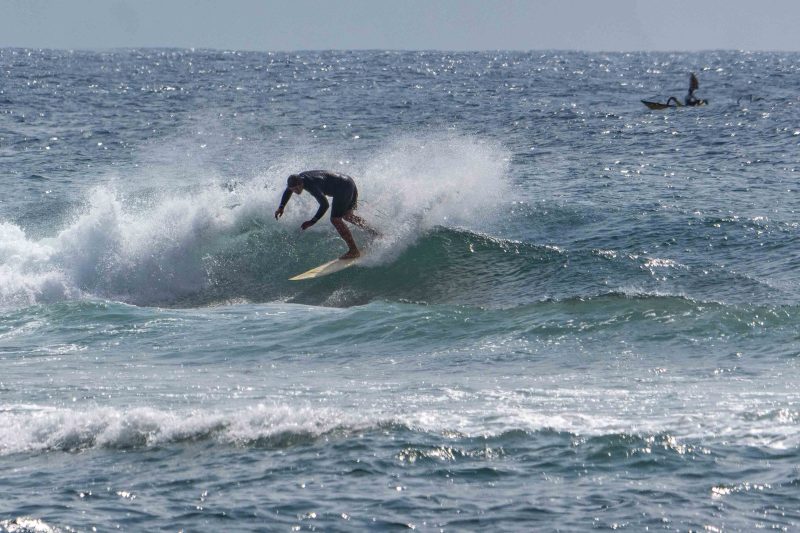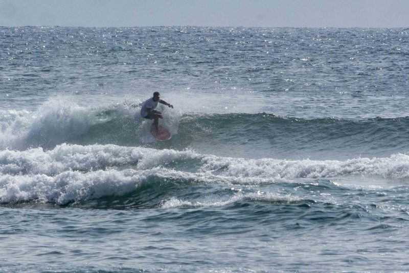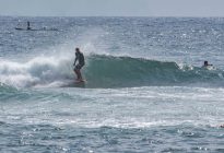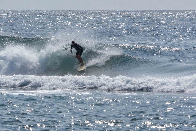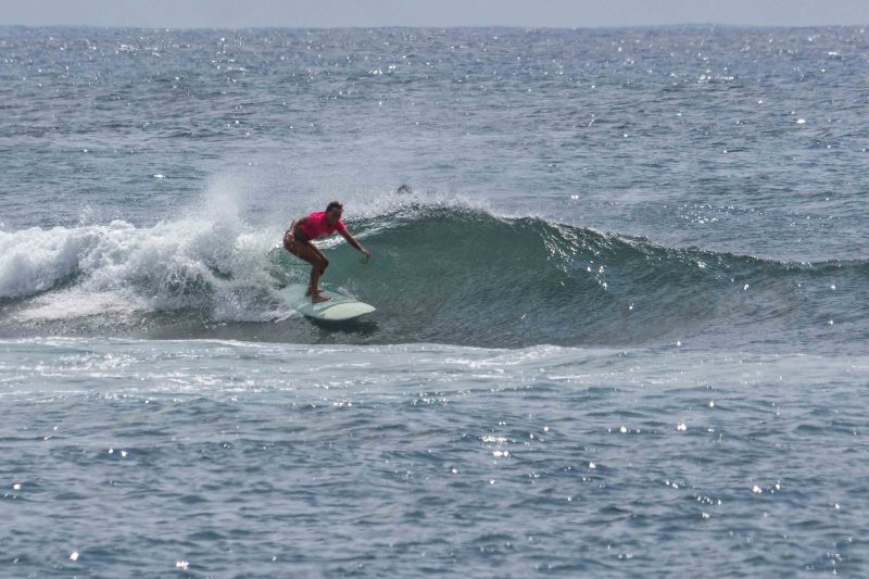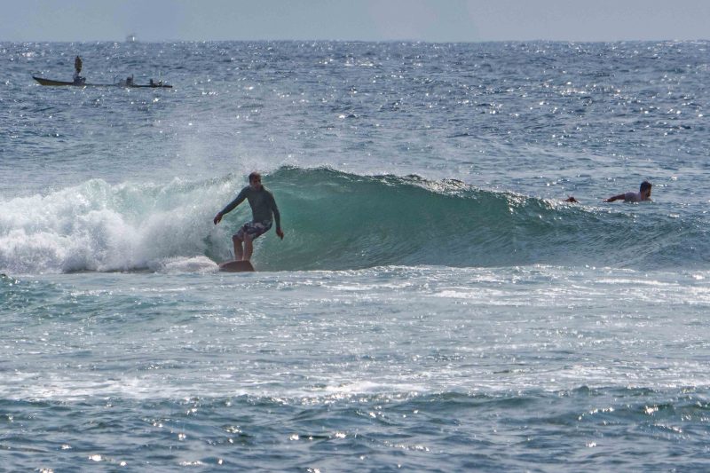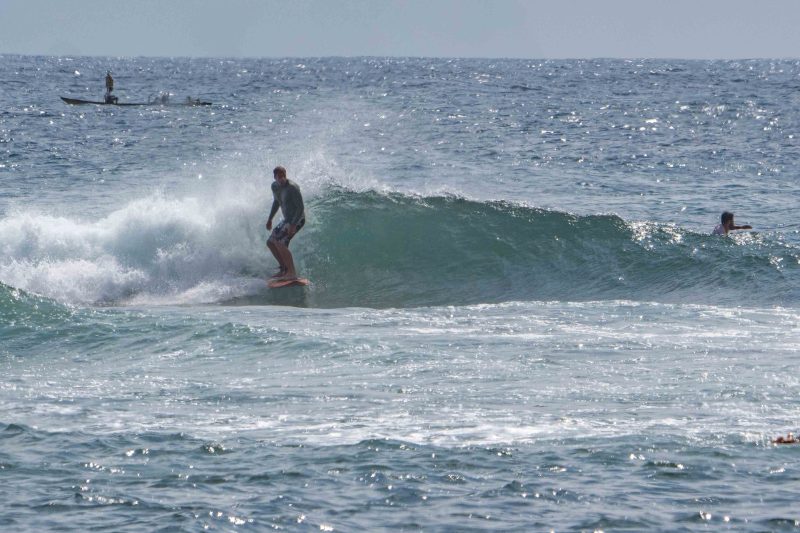 Fun waves at Mengiat this morning! There was plenty of wind, but the surf was pumping with a light crowd! The stiff offshore breeze allowed fun left and right peaks to form. The lefts offered a particularly fun, wedgy shape, which allowed for plenty of speed for the surfers to do their best turns. The waves were in the shoulder-high range, with a few larger waves. Most of the crowd chose to surf at Chicken Wings on the other side of the deep channel, which made the lefts and rights at Mengiat that much more appealing.