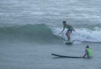 This morning, our beginner surfers braved the out-of-season rain and paddled out to Baby Padang. Despite the rain, the surfers had a great time surfing the waist-high inside reform of the surf break as the larger sets broke on the outside. The swell has picked up considerably overnight, approaching the double overhead range at the standout spots. The offshore tropical system caused the wind to blow slightly onshore; however, the protected wave at Padang Padang remained clean.