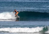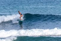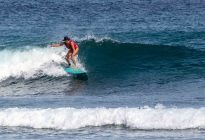 Our intermediate surfers set off to Balangan this morning, where they enjoyed excellent tropical surf in a stunningly beautiful location! The swell has continued to taper in size since yesterday, with the forecast reading 4 ft. at 13 seconds from 213 degrees. The waves broke around shoulder high on the sets, with occasional larger sets coming through. The wind blew offshore for the duration of the session, and the wave faces were as clean as they were blue. We waited till after breakfast for the tide to come up enough to cover the reef with this morning’s low tide of .8 meters at 6:30 AM (Benoa).