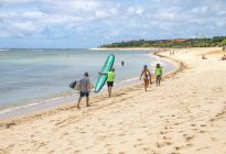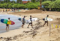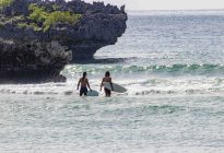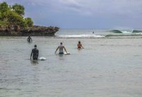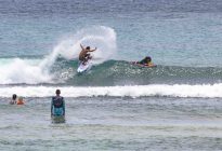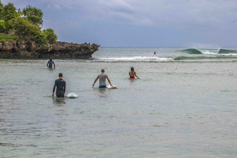 Our intermediate group was off to Black Stone this morning, while our advanced group surfed the tall peaks at Geger Left. At Black Stone, the surfers enjoyed head-high waves with the occasional larger set wave. The wind blew moderately side-shore to offshore, and it rained for the duration of the session. The swell came in on the forecast at 4.5 ft. at 13 seconds from 208 degrees, and the tide peaked for the morning at 9:14 AM at 2.04 meters. The surfers found fun left and right-breaking waves at the peak in the middle of the beach, which provided fast walls for the surfers to glide along.