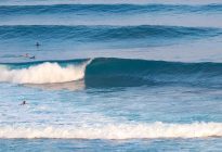 Small wave fun at Uluwatu this morning! Our intermediate surfers were up bright and early to catch the high-tide running waves at The Racetrack. Uluwatu always produces at least a few head-high waves; however most of the sets were in the shoulder-high range, which is a great size for intermediate surfing. The Tradewind had kicked into gear early, and the temperature was about as cool as it gets (A not too cold 26°C water/25°C air temperature). The intermediate surfers enjoyed their opportunity to surf the long, running lefts at such an iconic break in improver-friendly conditions.